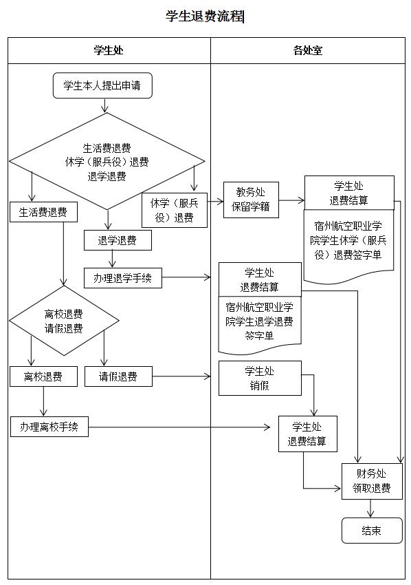 学生因服兵役退费时,到学生处领取采彡争霸学生退学(服兵役)退费签字单办理退费结算后,再持表单到财务处(实训室1楼)领取退费。 |