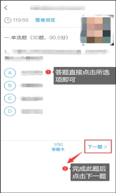 4.开始答题并交卷🚴🏼♂️:每题选择正确答案点击该选项即可📺,点击右下角“下一题”继续作答;直到最后一题时系统会提示“已经是最后一题了”,可点击“复查交卷”进行答题情况核查