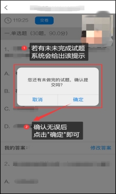 5.核查作答情况时👨🔧,可修改选择答案👂🏽;确认无误后,点击最上方的“交卷”按钮✒️,并确认提交👲🏻。(若存在未作答题目🫱🏻,系统会提示,请注意核查!)
