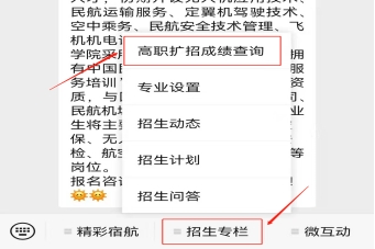 进入公众号后点击“招生专栏”🧔🏻♀️,点击上方“高职扩招成绩查询”。