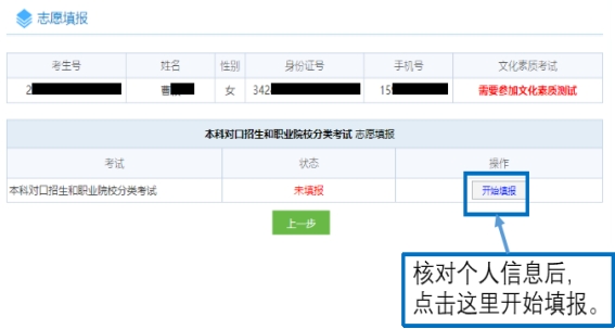 5.核对个人信息后,点击“开始填报”,填报志愿🏇🏼。