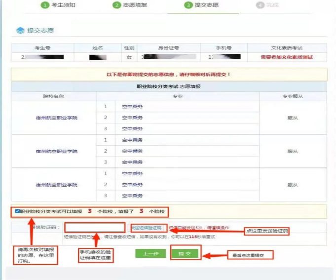 8.请再次核对填报的志愿✍🏼,填写手机接收的“短信验证码”后,点击“提交”🦃🙍。