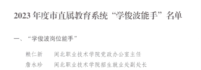 为深入学习贯彻习近平新时代中国特色社会主义思想和党的二十大精神,落实习近平总书记关于教育工作的重要论述精神,按照市委“深学争优、敢为争先、实干争效”行动部署,在学院涌现一批政治坚定、敢于担当 、敢拼敢闯、成绩突出、群众认可的先进典型,近日,市委教育工委表彰了一批“学俊波能力”,我院赖仁新、詹永珍等二位同志被授予“学俊波岗位能手”荣誉称号;白雁飞、魏常锦、张海丽、张梦君等四位教师被授予“学俊波教学能手”荣誉称号。