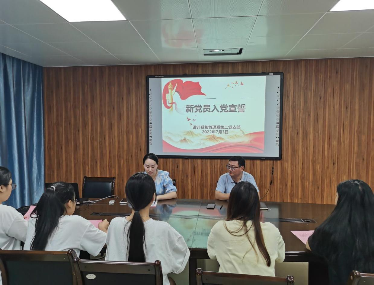 为纪念中国共产党建党101周年,迎接党的二十大胜利召开,激发全体党员爱党爱国热情,设计系和管理系第二党支部于7月3日,设计系和管理系第二党支部在行政楼507会议室开展“忆初心,结合家乡革命历史谈如何更高效学习四史”和暨新党员入党宣誓为支部党员过政治生日主题党日活动。活动由支部纪检委员赵雅珍主持,全体党员参加了活动。