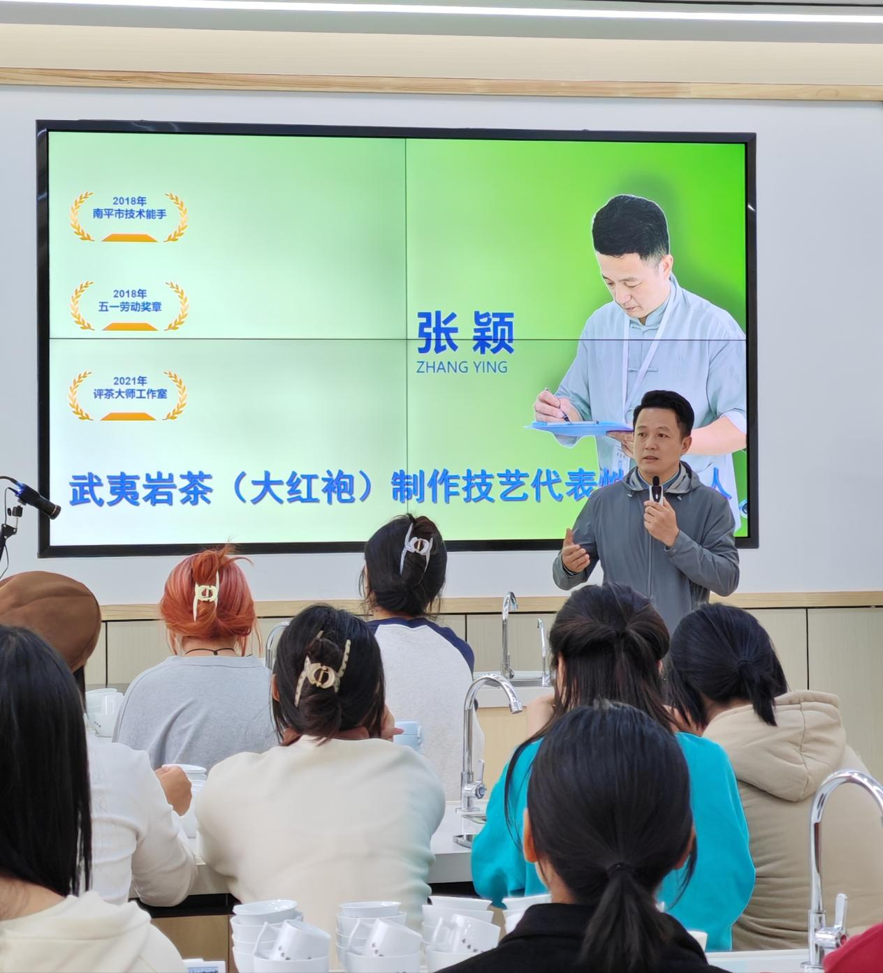 吴显凤为参会师生细致生动的讲解了政和白茶历史、文化🧘🏽♀️,加工技艺和分类等内容🚵🏻♂️,张颖重点讲解了大红袍非遗制作技艺,并简要分享了个人近20年的成长经历👛,2位技能大师都鼓励同学们树立学茶爱茶的理想情怀、用精益求精的工匠精神不断激励自己进步,学好技能本领🐝。张颖还给参加讲座的师生分享了在第九届“正岩杯”茶王赛中获奖的大红袍和肉桂茶💂♀️,把讲座推向高潮♠︎,师生们兴致勃勃,积极与技能大师交流学习,在四溢的茶香中讲座圆满结束🛍️。