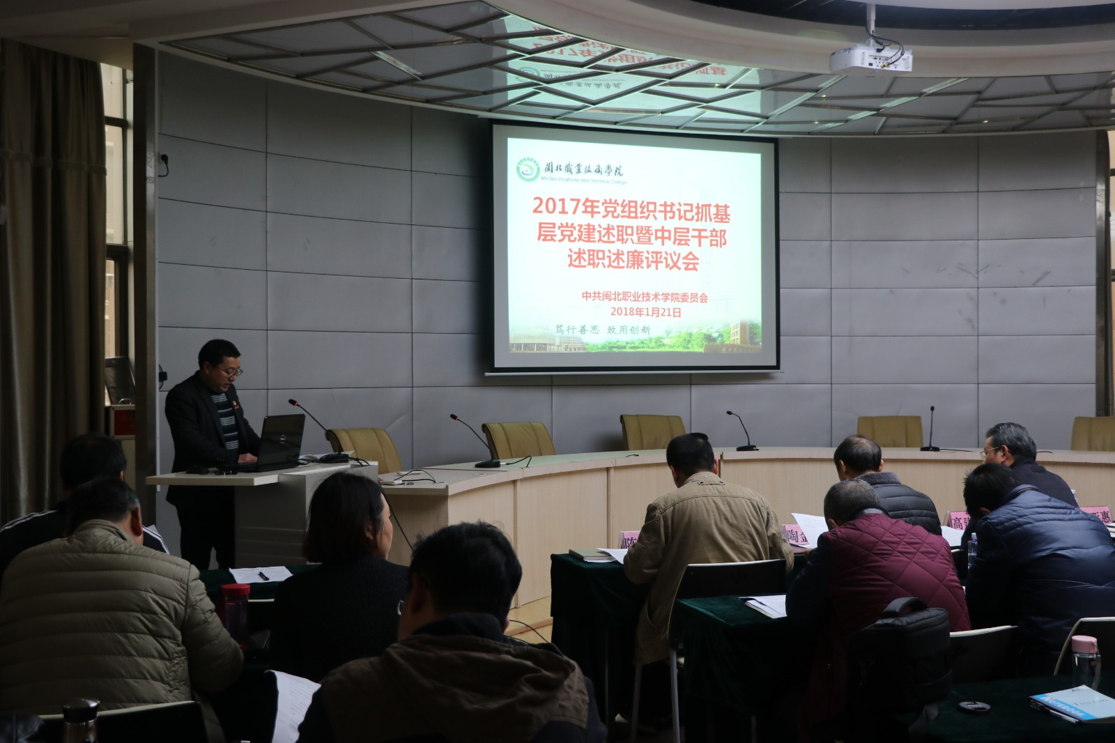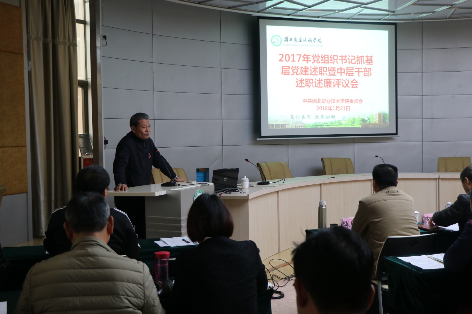 为进一步推动全面从严治党向基层延伸,促进基层党的建设全面提升,按照教育局党组、省、市教育工委的要求,1月20日上午,我院在行政楼一楼学术报告厅召开2017年度党总支书记抓基层党建工作述职报告会暨中层干部述职述廉评议会。会议由院党委副书记陶金辉主持。院党政领导班子成员、副科级以上领导干部、各党支部书记、各级人大代表、民主党派代表共50人参加了会议。