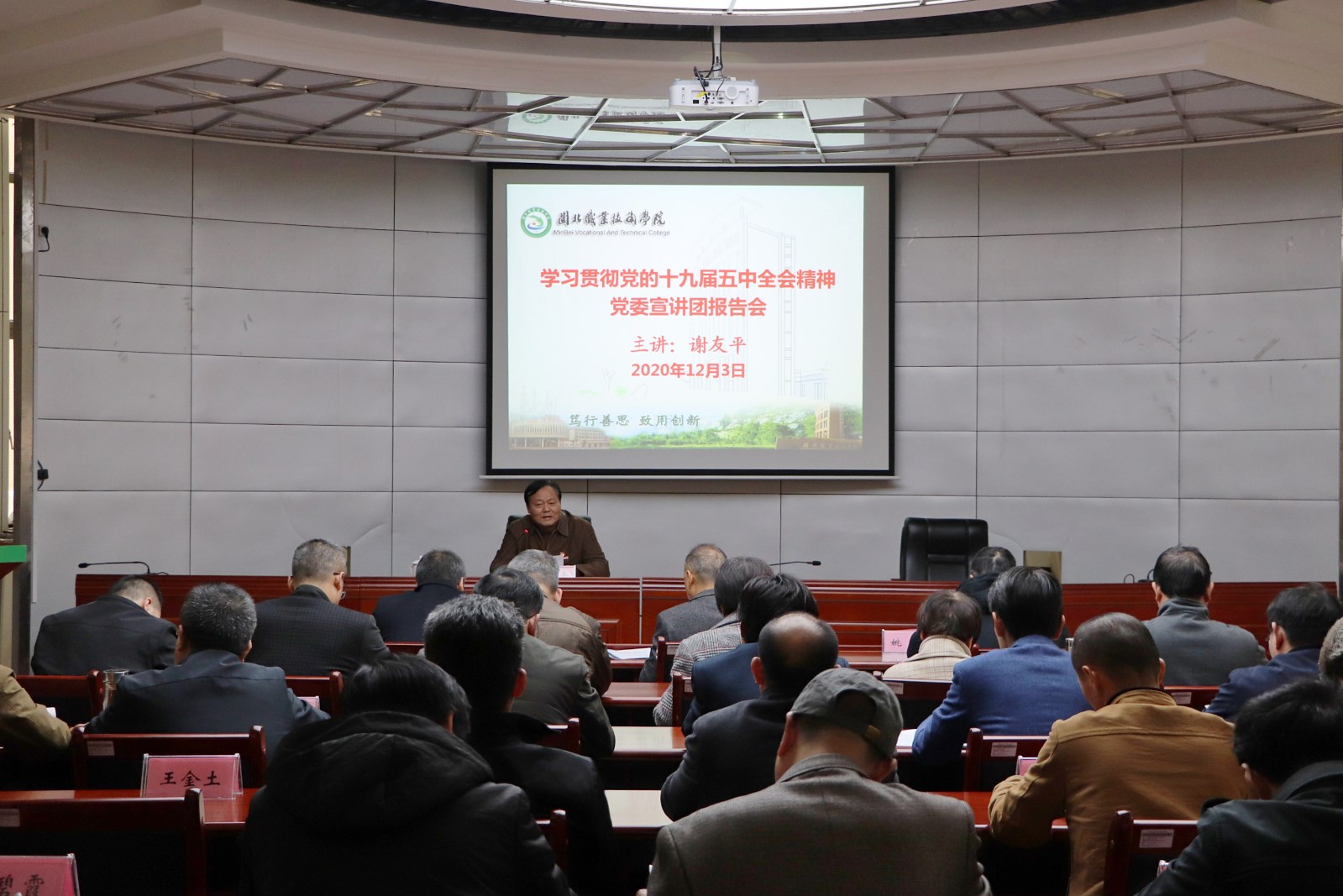 12月3日下午,采彡争霸学习宣传贯彻党的十九届五中全会精神宣讲团报告会在行政楼一楼报告厅举行。学院党委书记谢友平作学习贯彻党的十九届五中全会精神宣讲报告,学院党政班子成员,各党总支、党支部书记,各处室、系部负责人,副科以上干部及师生代表50余人参加报告会。