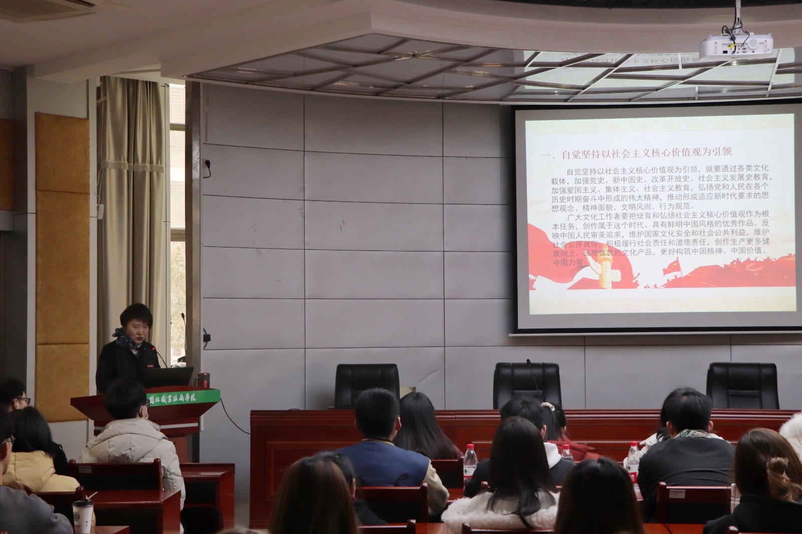 陈婷主任围绕《深入学习贯彻党的十九届五中全会精神——繁荣发展文化事业和文化产业,建成文化强国》主题,从自觉坚持以社会主义核心价值观为引领、始终坚持党的全面领导这个根本保证、牢牢把握推动高质量发展这个根本主题、有效激活改革创新这个根本动力、紧紧扣住满足人民日益增长的美好生活需要这个根本目的五个方面进行了阐述,强调了在2035年建成文化强国的远景目标,希望同学们不忘习近平总书记的嘱托,努力学习,“共走技能成才之路、共抒技能报国之志”,“裁剪梦想形状、设计职业蓝图”,以青春和热血铸就“文化强国”的光明未来。