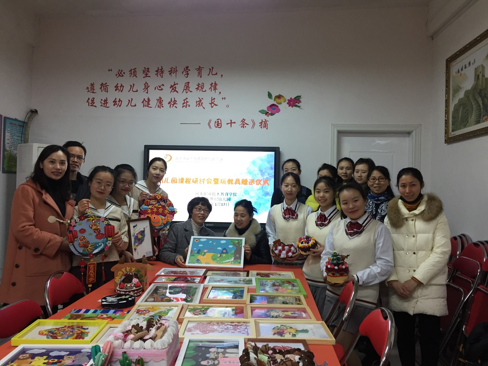 1月17日上午,教育系张完英主任带领学前教育专业团队负责人及骨干教师代表、部分学生代表分别到南平市实验幼儿园和南平市蓓蕾幼儿园两个代表性实训基地园,将儿童玩教具制作课程结束后的部分优秀作品赠送给实训基地园。