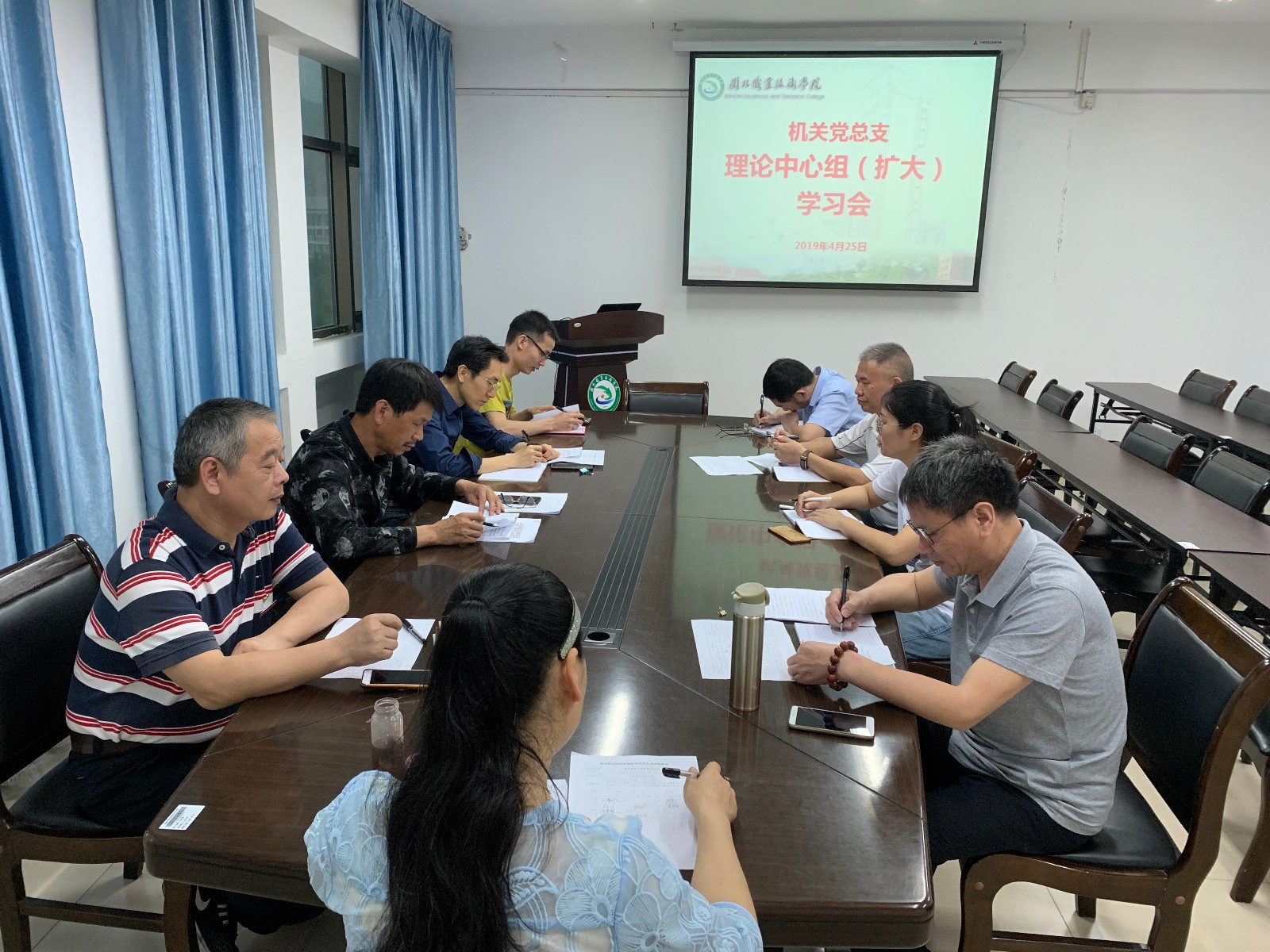 2019年4月25日上午,学院机关党总支在行政楼五楼会议室召开理论中心组第三次(扩大)学习会,机关党总支班子成员、各支部书记和支部委员参加了会议。会议由机关党总支叶常明书记主持。会上,叶常明书记传达了学院2019年党建工作会议精神、学习传达了全省教育大会和高校党建工作会议精神,并组织开展形式主义、官僚主义突出问题集中整治专题学习讨论。与会委员结合自身岗位和工作实际,围绕主题依次发言,每位委员查找了在形式主义、官僚主义方面存在的突出问题、剖析了原因、提出了整改措施和今后努力的方向。