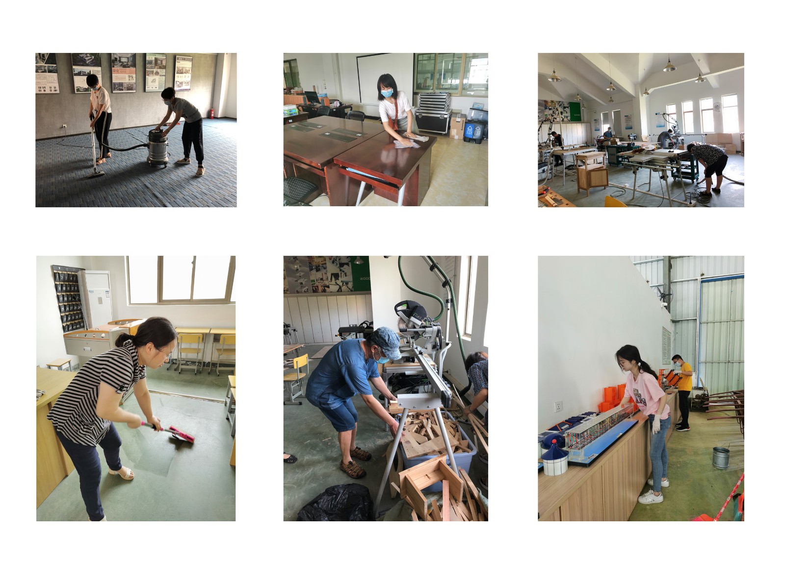 全体专业教师,按照专业团队分组,对餐饮实训室、客房实训室;企业沙盘模拟实训室、手工账实训室;虚拟仿真施工实训室、工程检测实训室;建筑室内设计专业综合实训室;创意产品设计加工中心;服装生产实训室等的地面、桌面、部分设备表面、常用工具等进行打扫消毒,做到不留卫生死角,为本学期实践教学创造干净、卫生的环境。