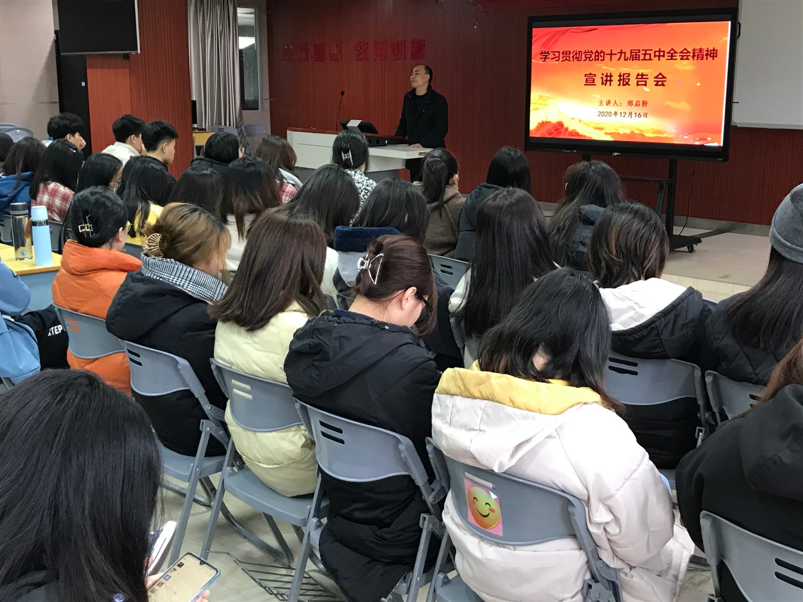 12月16日下午,信息系和食品系联合党总支召开学习贯彻党的十九届五中全会精神第二场宣讲报告会,党总支常务副书记郑启阶为参会的近百名大二学生代表进行了宣讲。