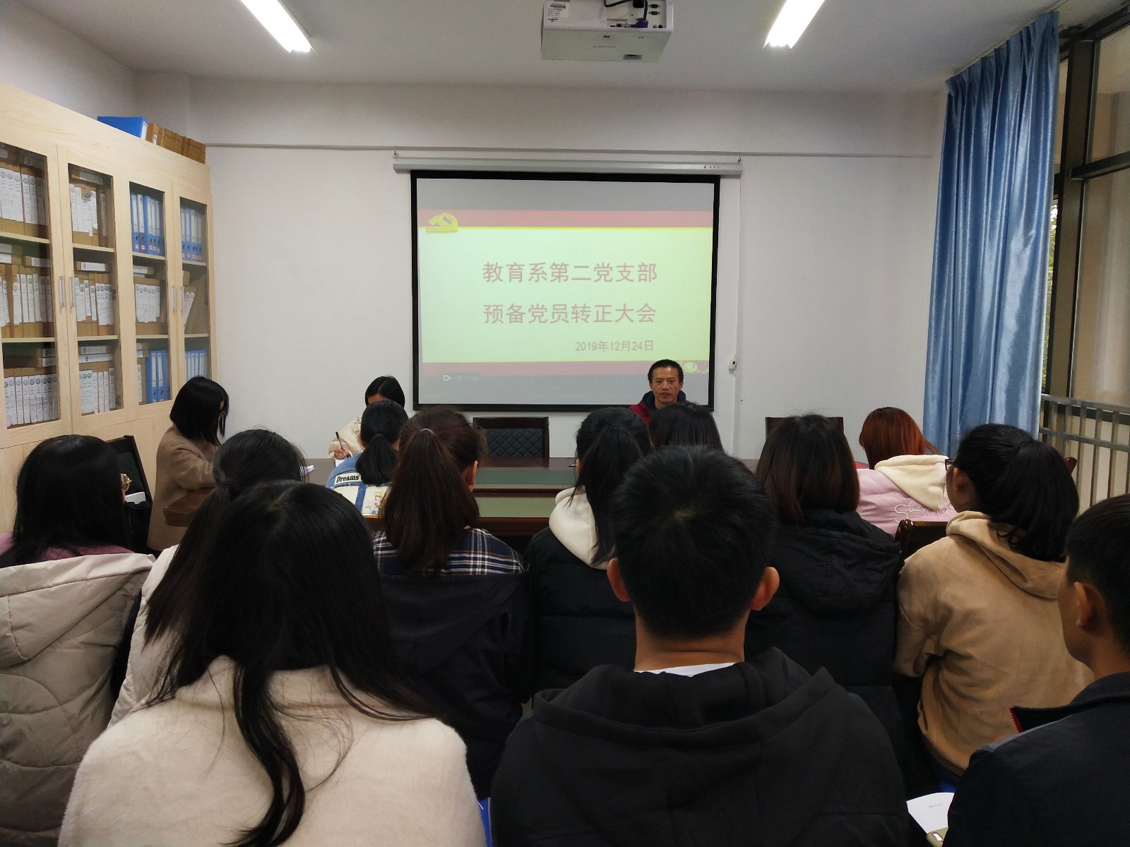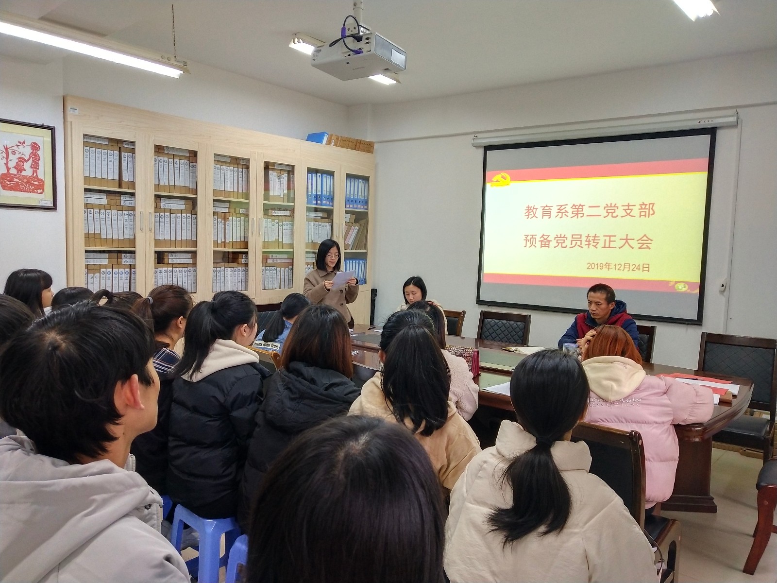 2019年12月24日,教育系第二党支部在行政楼204室会议室召开预备党员转正大会。参加此次会议的有教育系第二支部正式党员🧶、预备党员,会议由支部书记张灵暄同志主持🧗。