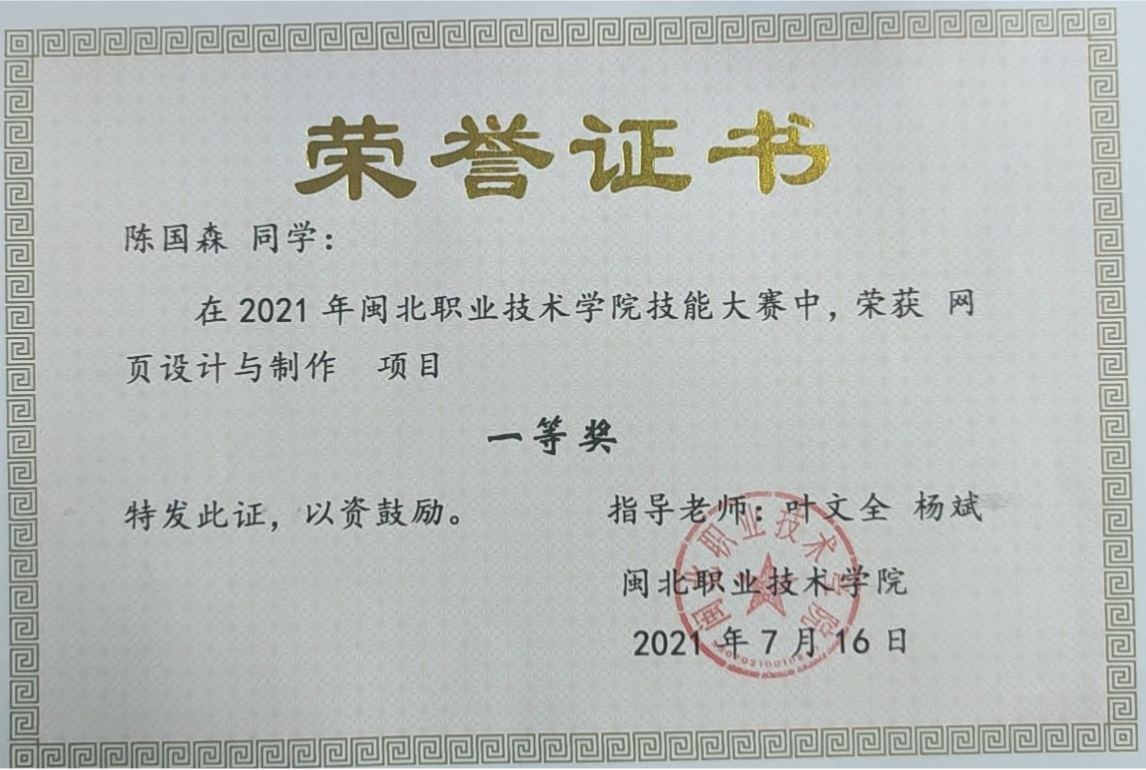 7月16日,软件学院20级陈国森和郑宇凡两位同学在2021年采彡争霸技能大赛中,荣获网页设计与制作项目一等奖。