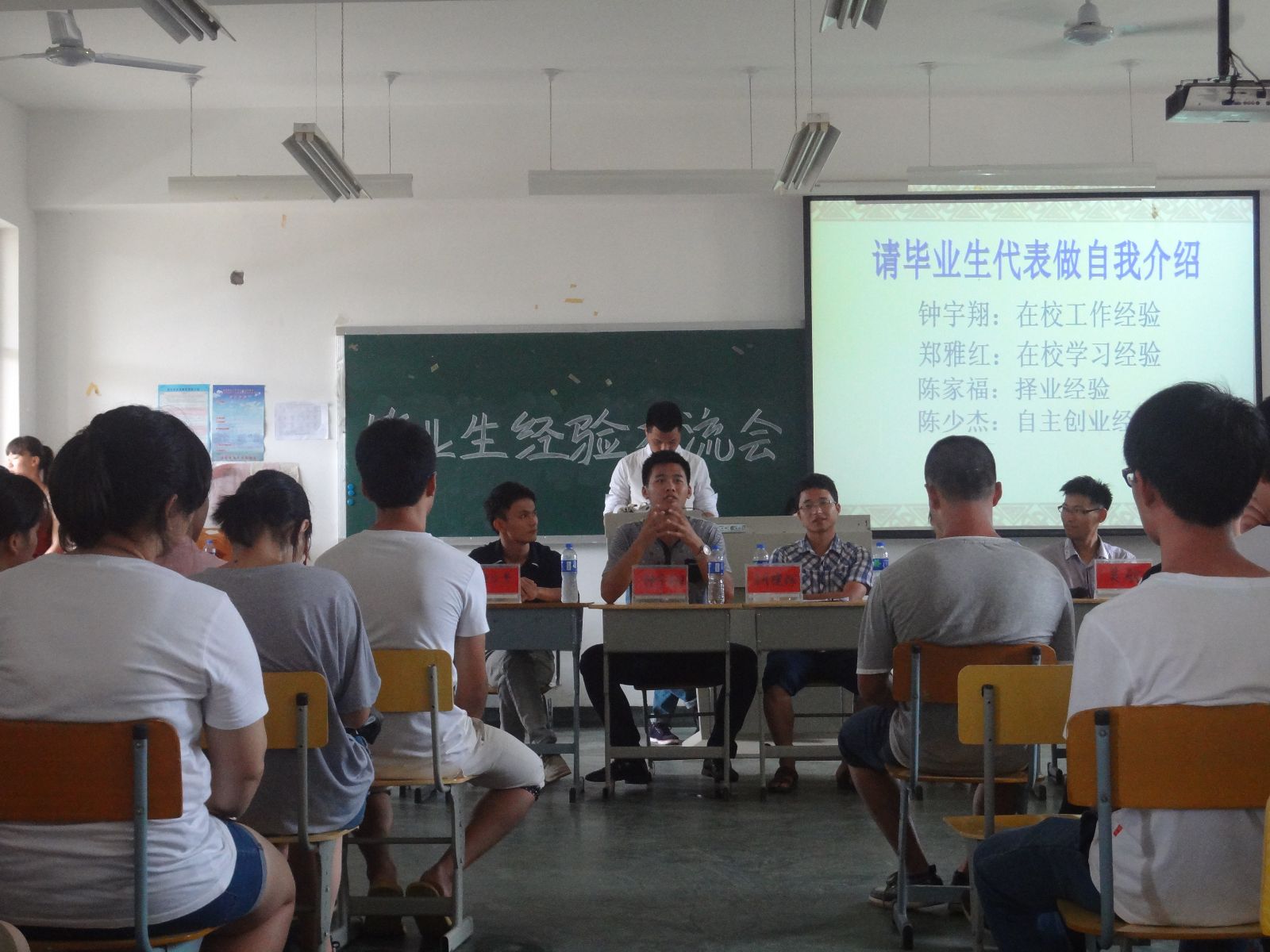 2015年6月3日下午,我系在305教室举办2015届毕业生经验交流会,系辅导员胡建辉、张灵暄⚔️、吴航出席了本次交流会。会议还邀请了陈少杰、钟宇翔🫃、郑雅红♋️、陈家福等四位毕业生代表🚅👩🏼🏭,介绍和分享在校工作经验、专升本经验、创业经验等。