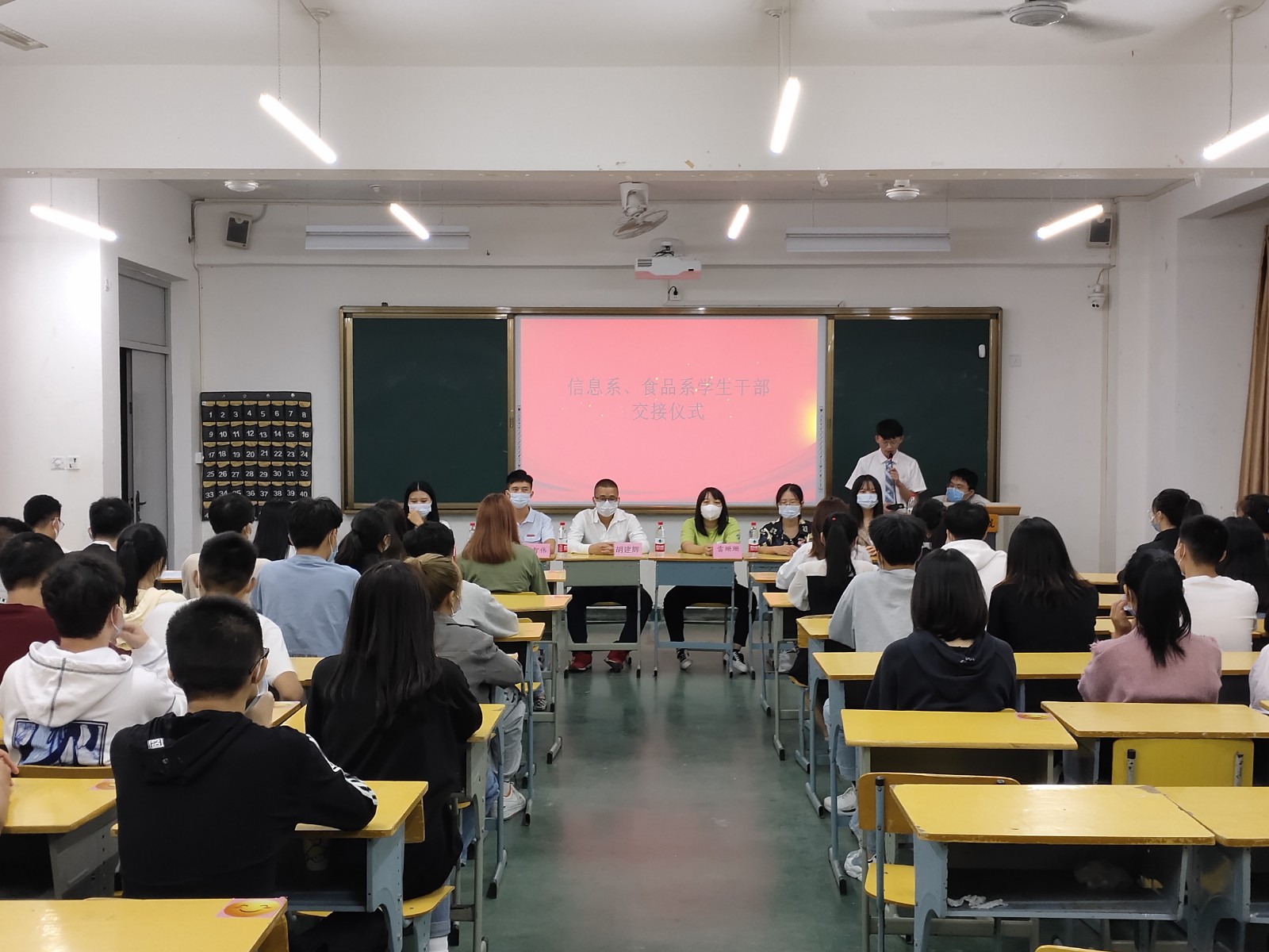 会上上一届学生干部代表徐伟森首先分享了一年来的工作经历,勉励新一届学生干部积极进取🏞,努力工作🕊。随后辅导员宋智伟宣读了新一届系级各部门学生干部成员名单📥,全体老师为他们颁授工作牌🥭。蔡艺聪上台代表新一届学生干部表决心🎤。