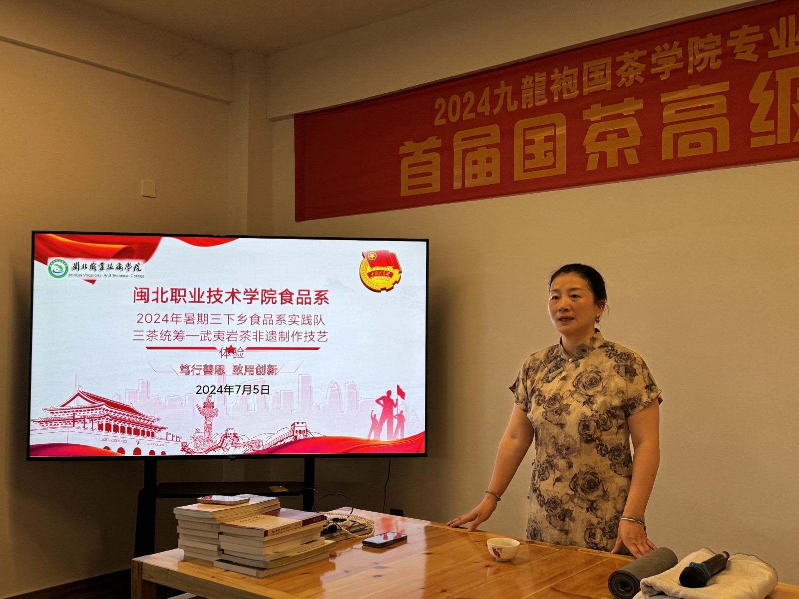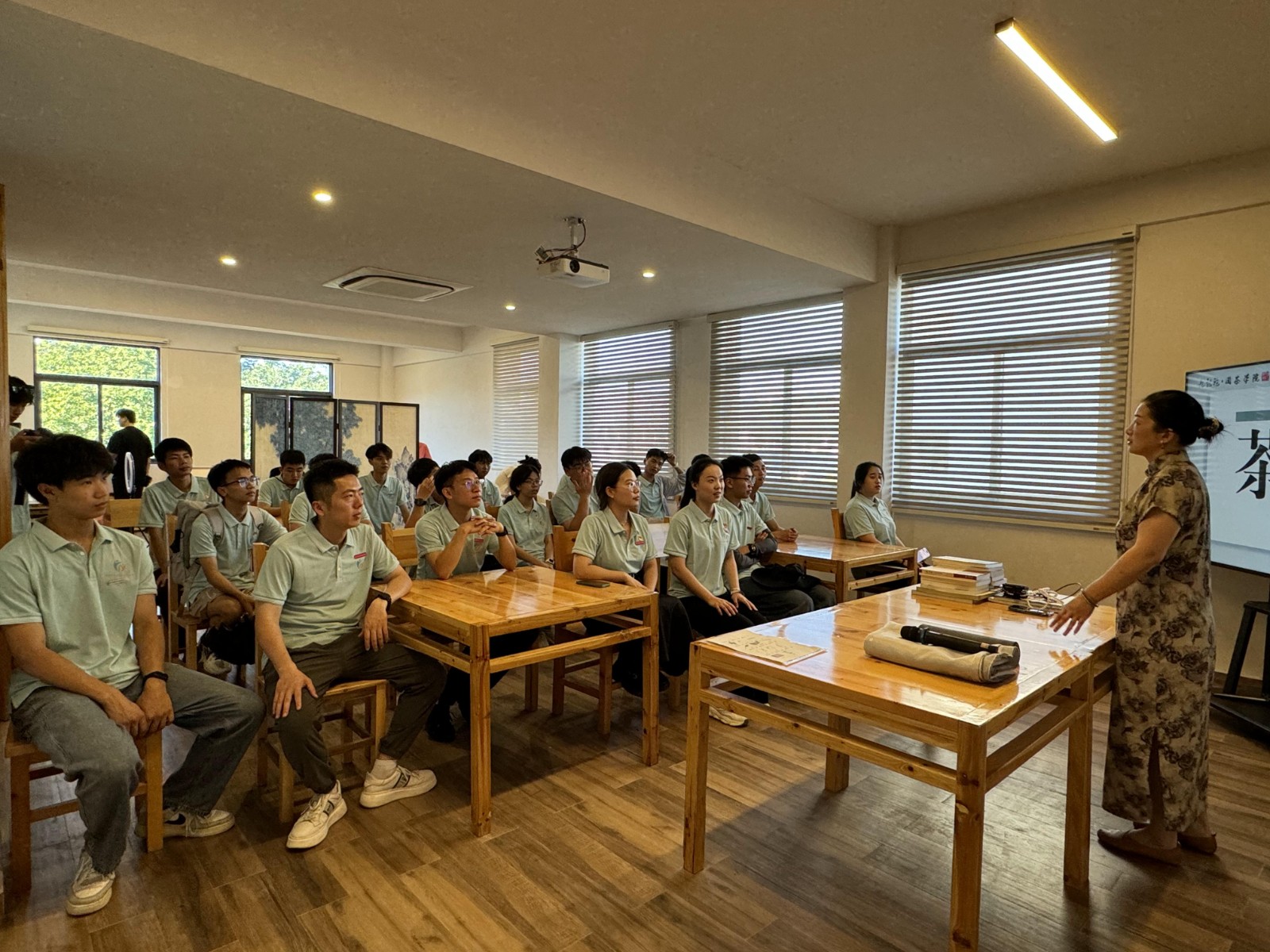 九龍袍茶业有限公司还精心组织了国茶学院培训活动,茶艺老师向同学们传授了现代农业知识与技能,并详细讲解了识茶、煮茶、泡茶、倒茶、品茶礼仪、茶与健康、茶与修养等方面的知识。茶艺老师以优雅的姿态,现场示范并介绍了每一件茶艺器皿的名称与使用方法,同时展示了茶道技艺与礼仪。在茶艺老师的悉心指导下,同学们不仅掌握了泡茶的技巧,更展现了整体的优雅与和谐。实践队成员们积极投入品茶活动,品味茶的醇厚香气,对茶文化有了更为深刻的理解。