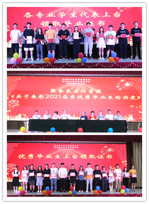在庄严的国歌声中典礼拉开了序幕。郑启阶书记首先深情寄语2021届毕业生,表达对毕业生的美好祝愿;随后张金良主任宣布了我系2021届学生毕业情况,与典礼嘉宾一起为各专业毕业生代表、二元制计算机毕业生代表颁发毕业证书并合影留念;接着张金良主任宣读了《关于表彰2021届系优秀毕业生的决定》,嘉宾为优秀毕业生颁发证书并合影留念;毕业生代表徐伟森在发言中表达了对母校的感激之情,表示在未来的工作生活中定不忘母校教诲,奋力谱写青春华章。最后胡建辉科长进行了征兵动员及就业跟踪工作宣讲,至此毕业典礼落下了帷幕。
