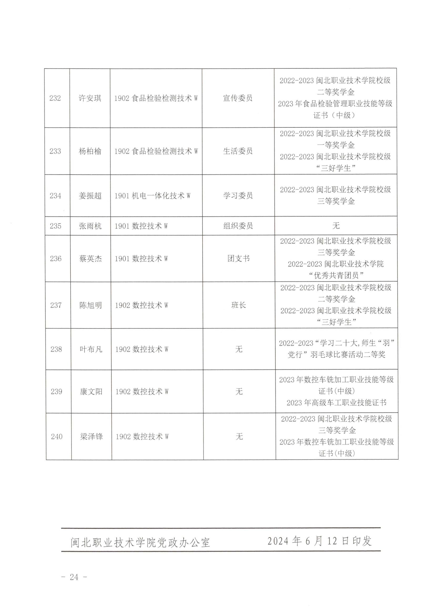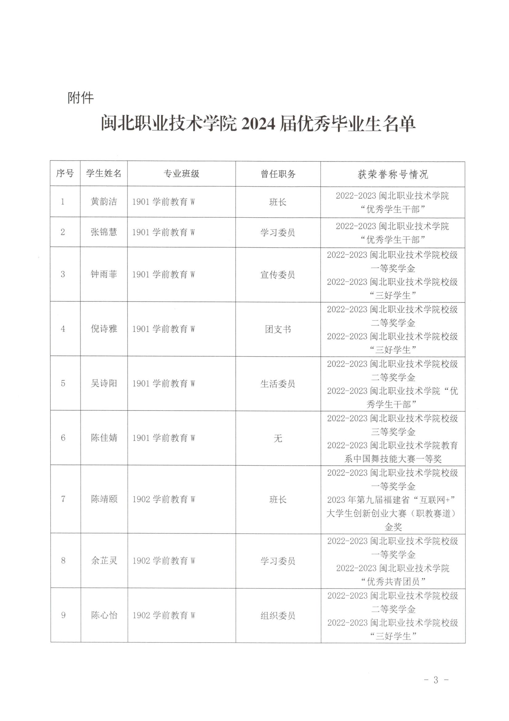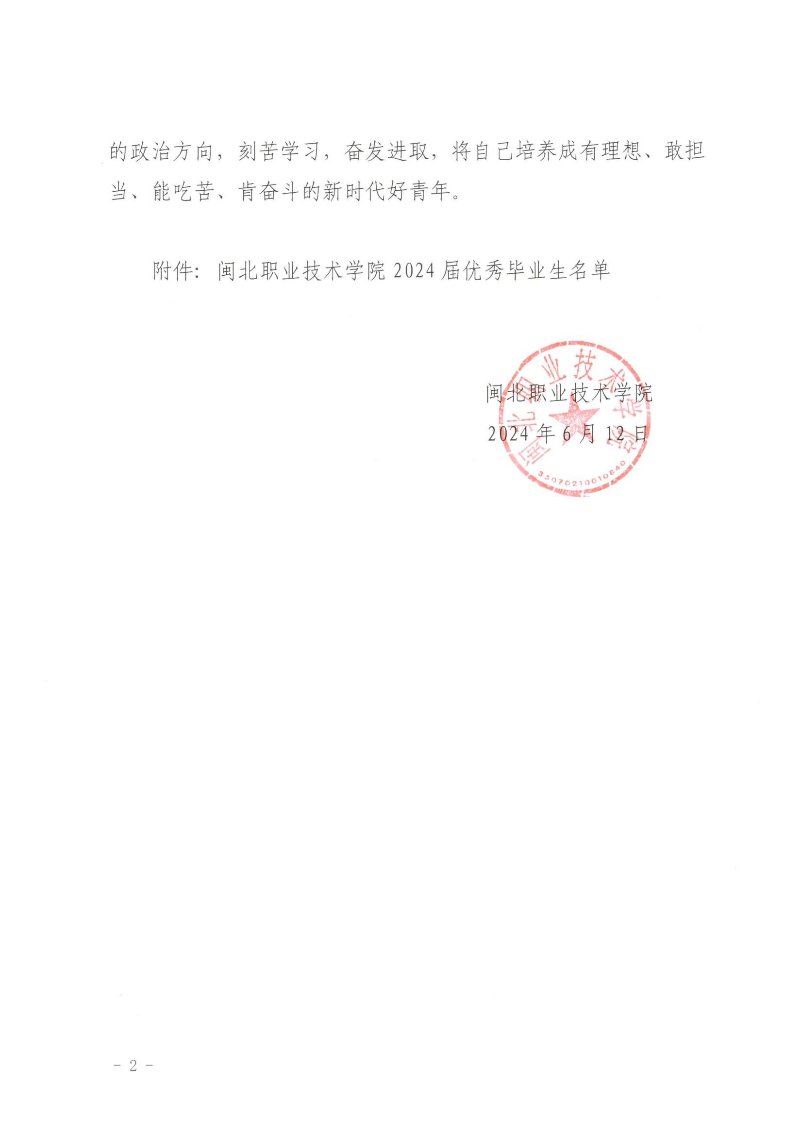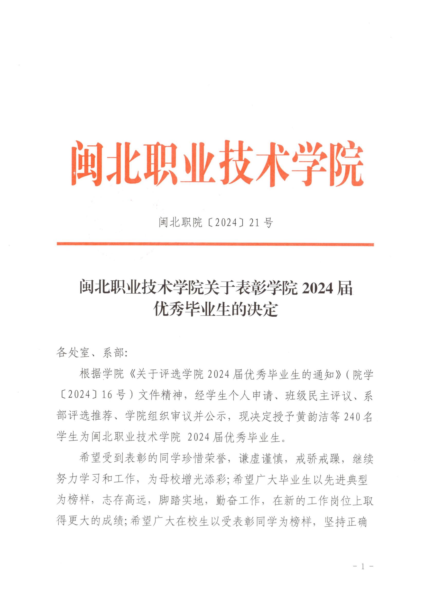 闽北职院〔2024〕21号 采彡争霸关于授予黄韵洁等240位同学为2024届优秀毕业生的决定
