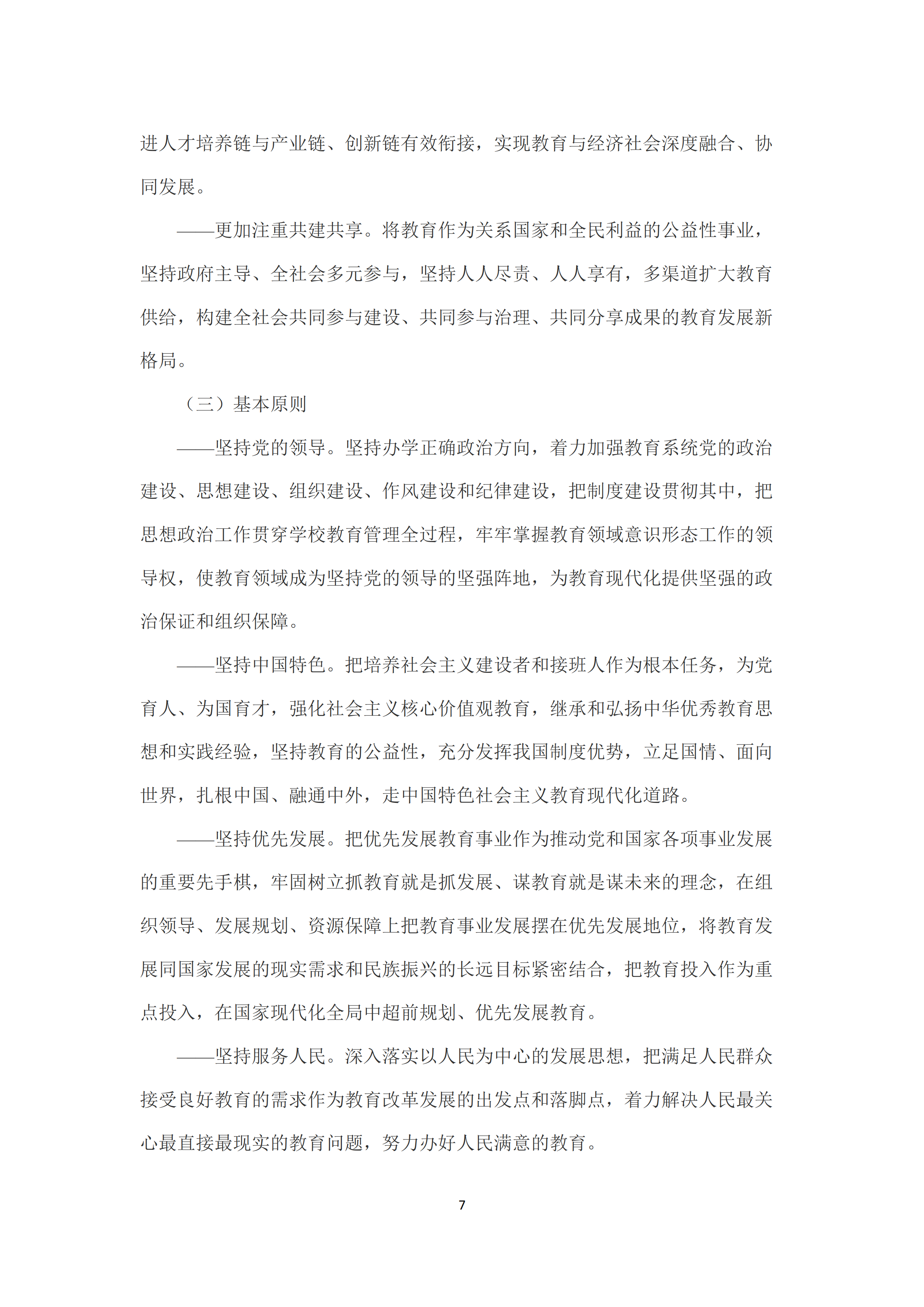 《中国教育现代化2035》提出了推进教育现代化的八大基本理念:更加注重以德为先,更加注重全面发展,更加注重面向人人,更加注重终身学习,更加注重因材施教,更加注重知行合一,更加注重融合发展,更加注重共建共享。明确了推进教育现代化的基本原则:坚持党的领导、坚持中国特色、坚持优先发展、坚持服务人民、坚持改革创新、坚持依法治教、坚持统筹推进。