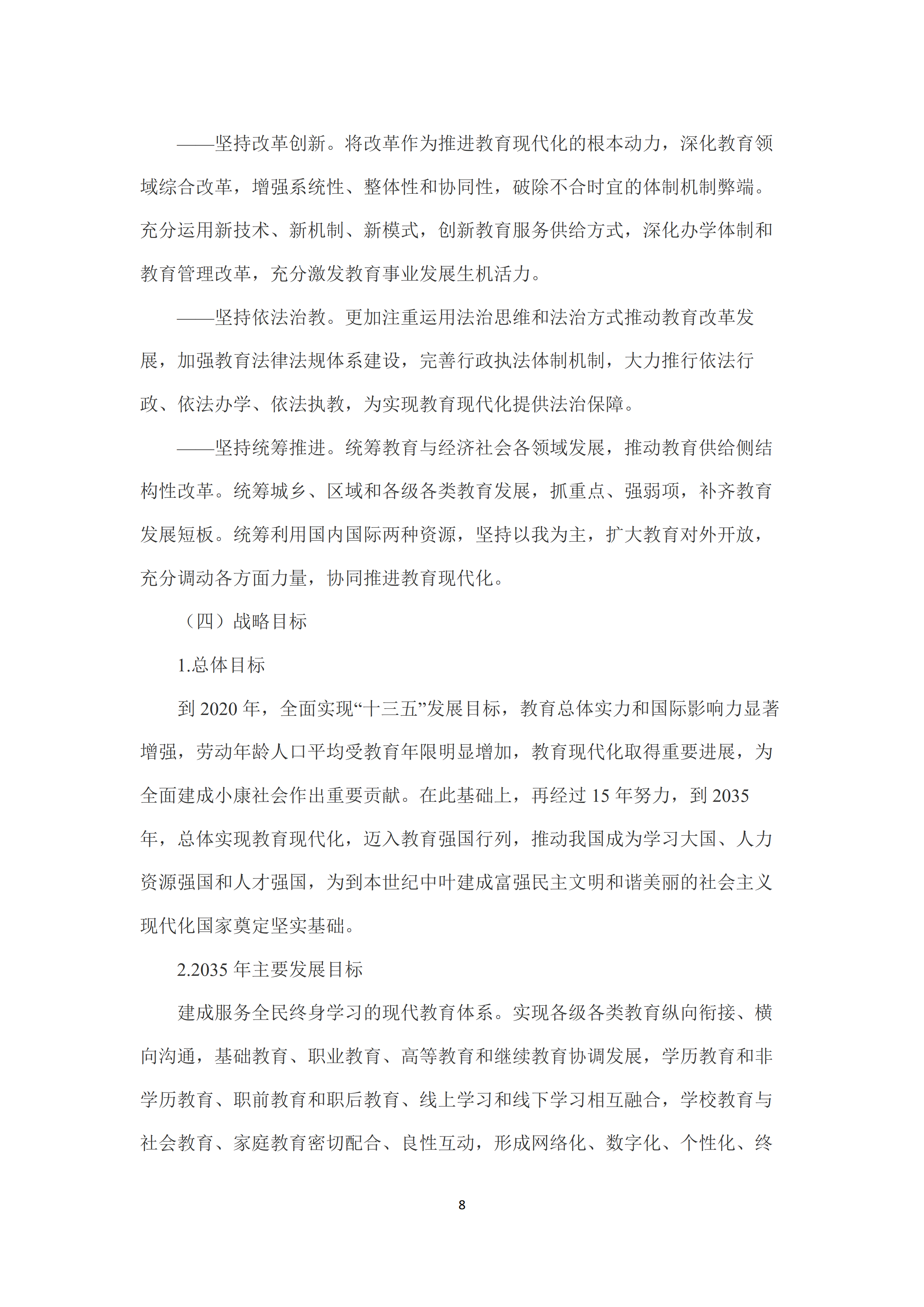 《中国教育现代化2035》提出,推进教育现代化的总体目标是:到2020年,全面实现“十三五”发展目标,教育总体实力和国际影响力显著增强,劳动年龄人口平均受教育年限明显增加,教育现代化取得重要进展,为全面建成小康社会作出重要贡献。在此基础上,再经过15年努力,到2035年,总体实现教育现代化,迈入教育强国行列,推动我国成为学习大国、人力资源强国和人才强国,为到本世纪中叶建成富强民主文明和谐美丽的社会主义现代化强国奠定坚实基础。2035年主要发展目标是:建成服务全民终身学习的现代教育体系、普及有质量的学前教育、实现优质均衡的义务教育、全面普及高中阶段教育、职业教育服务能力显著提升、高等教育竞争力明显提升、残疾儿童少年享有适合的教育、形成全社会共同参与的教育治理新格局。
