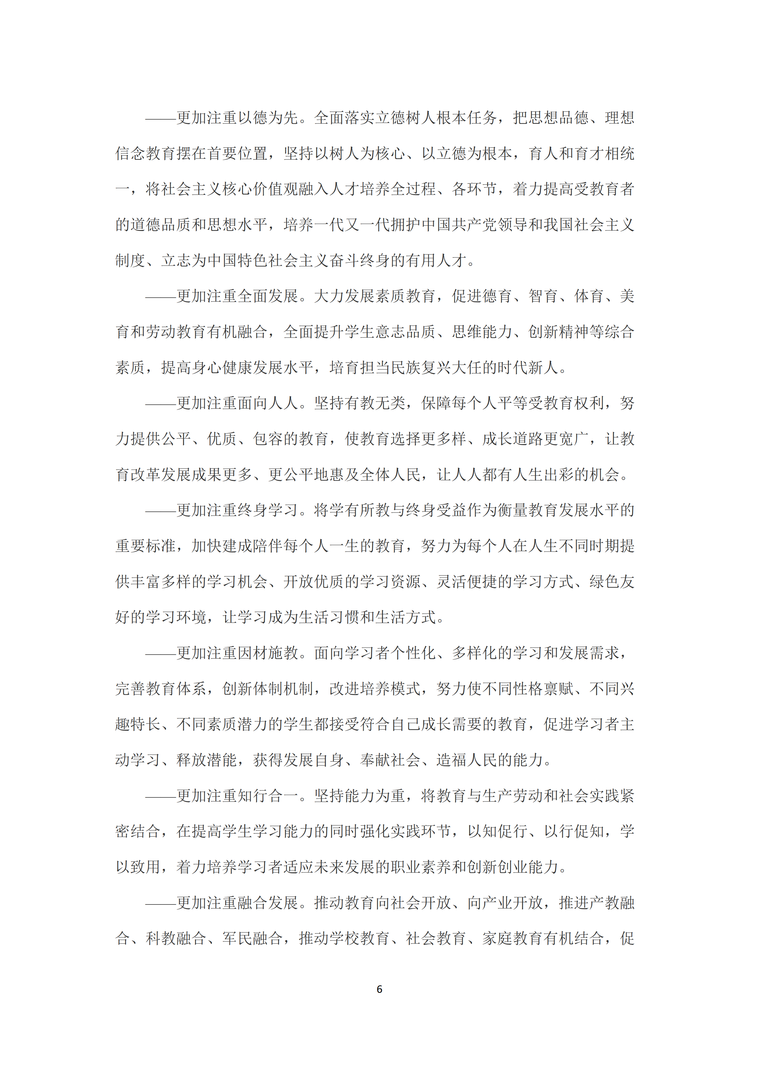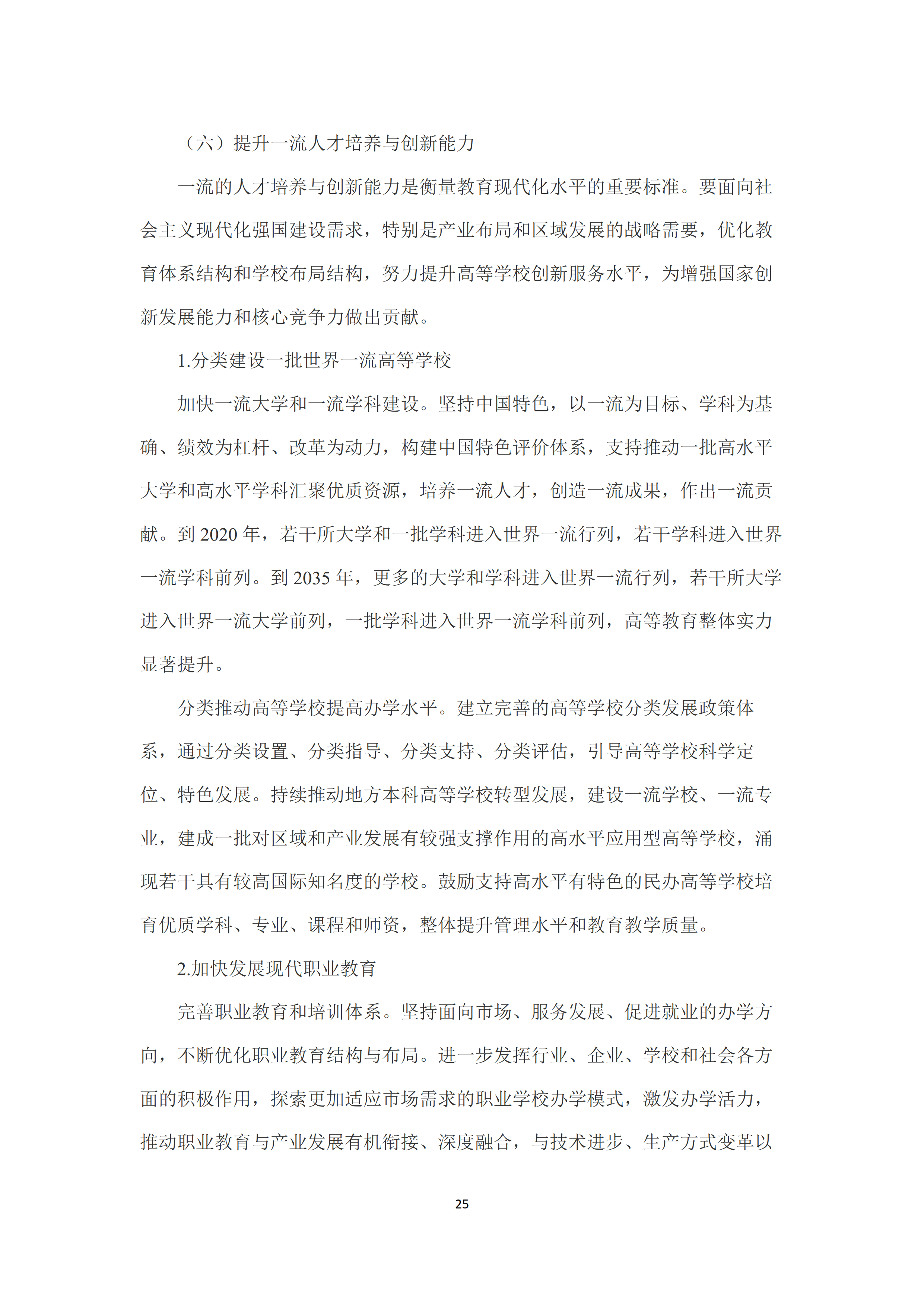 六是提升一流人才培养与创新能力。分类建设一批世界一流高等学校,建立完善的高等学校分类发展政策体系,引导高等学校科学定位、特色发展。持续推动地方本科高等学校转型发展。加快发展现代职业教育,不断优化职业教育结构与布局。推动职业教育与产业发展有机衔接、深度融合,集中力量建成一批中国特色高水平职业院校和专业。优化人才培养结构,综合运用招生计划、就业反馈、拨款、标准、评估等方式,引导高等学校和职业学校及时调整学科专业结构。加强创新人才特别是拔尖创新人才的培养,加大应用型、复合型、技术技能型人才培养比重。加强高等学校创新体系建设,建设一批国际一流的国家科技创新基地,加强应用基础研究,全面提升高等学校原始创新能力。探索构建产学研用深度融合的全链条、网络化、开放式协同创新联盟。提高高等学校哲学社会科学研究水平,加强中国特色新型智库建设。健全有利于激发创新活力和促进科技成果转化的科研体制。