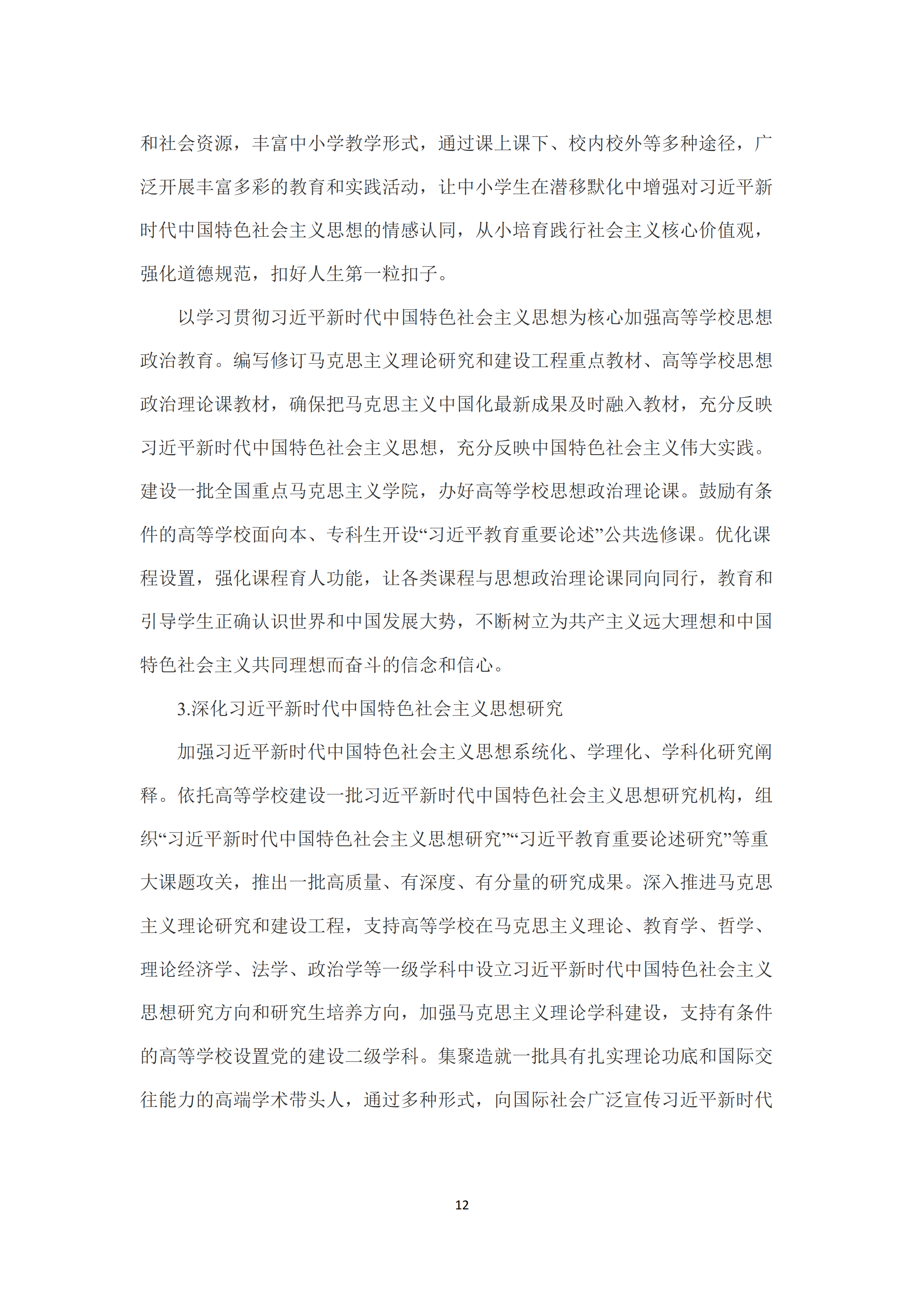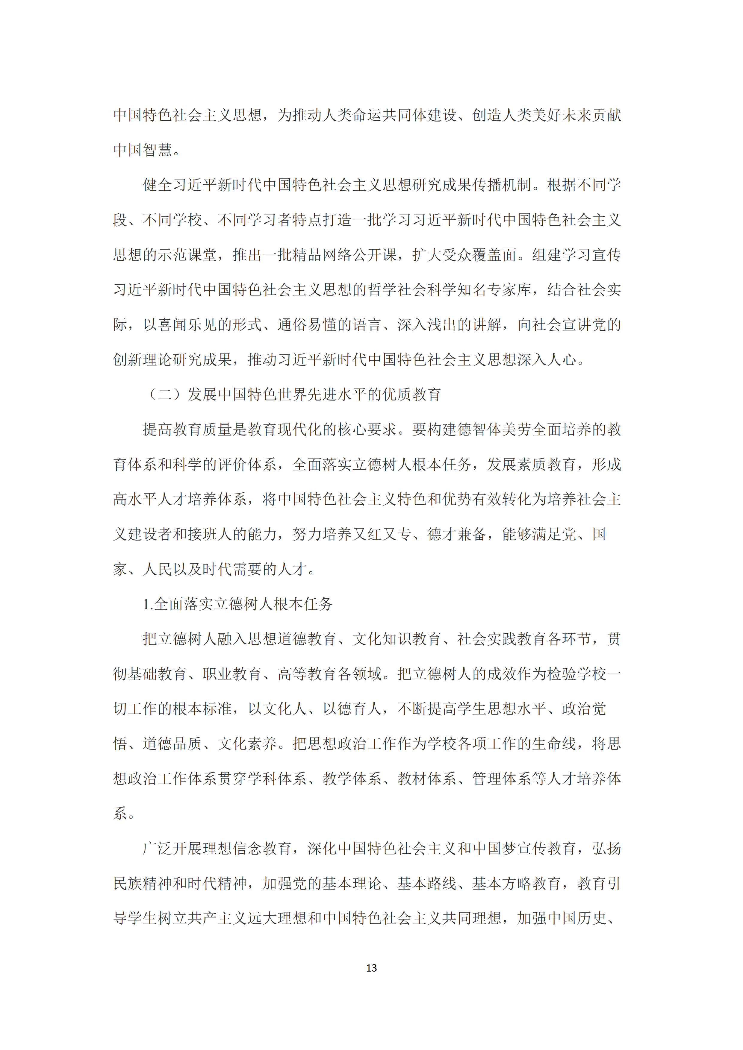 一是学习习近平新时代中国特色社会主义思想。把学习贯彻习近平新时代中国特色社会主义思想作为首要任务,贯穿到教育改革发展全过程,落实到教育现代化各领域各环节。以习近平新时代中国特色社会主义思想武装教育战线,推动习近平新时代中国特色社会主义思想进教材进课堂进头脑,将习近平新时代中国特色社会主义思想融入中小学教育,加强高等学校思想政治教育。加强习近平新时代中国特色社会主义思想系统化、学理化、学科化研究阐释,健全习近平新时代中国特色社会主义思想研究成果传播机制。