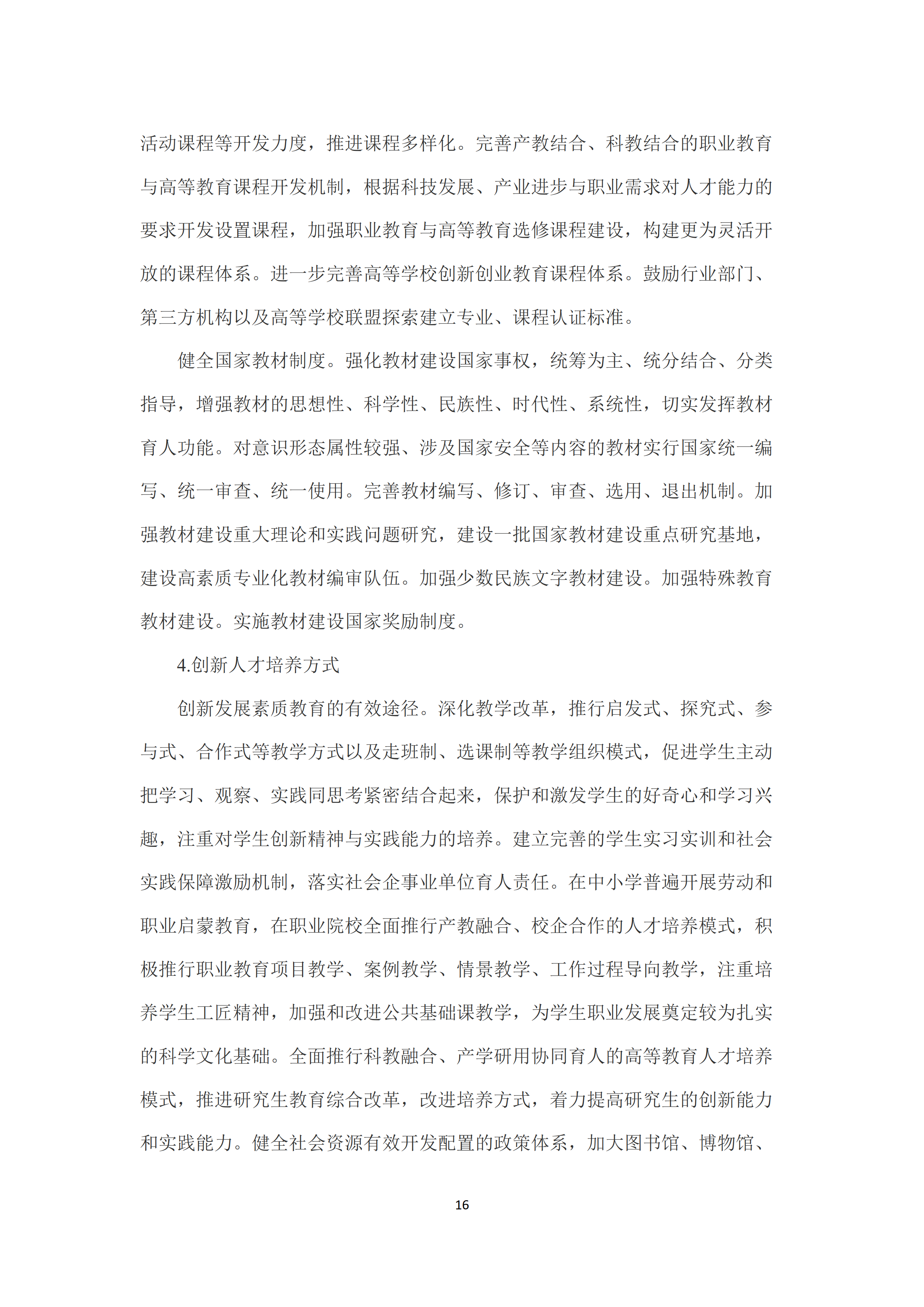八是加快信息化时代教育变革。建设智能化校园,统筹建设一体化智能化教学、管理与服务平台。利用现代技术加快推动人才培养模式改革,实现规模化教育与个性化培养的有机结合。创新教育服务业态,建立数字教育资源共建共享机制,完善利益分配机制、知识产权保护制度和新型教育服务监管制度。推进教育治理方式变革,加快形成现代化的教育管理与监测体系,推进管理精准化和决策科学化。