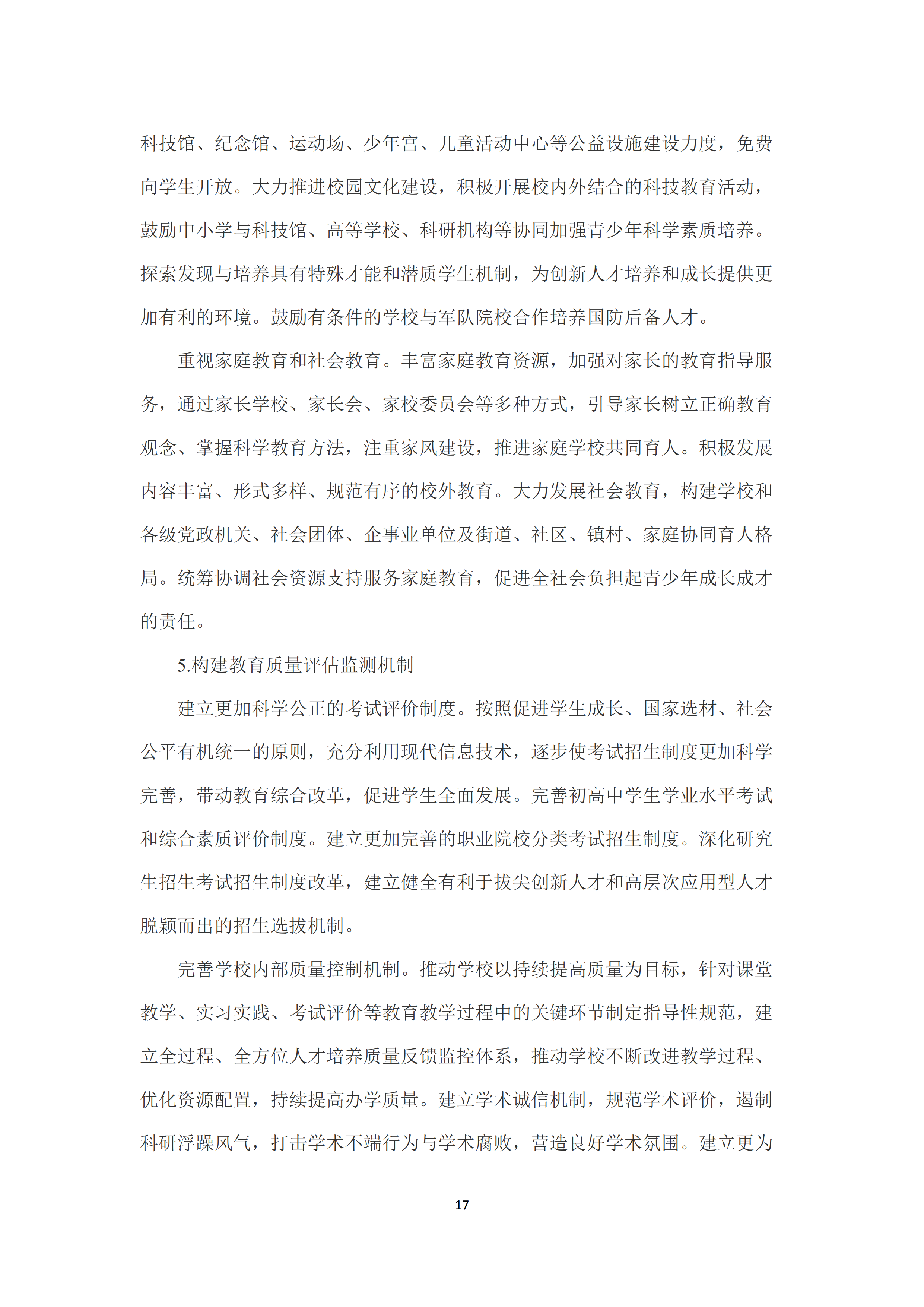 十是推进教育治理体系和治理能力现代化。提高教育法治化水平,构建完备的教育法律法规体系,健全学校办学法律支持体系。健全教育法律实施和监管机制。提升政府管理服务水平,提升政府综合运用法律、标准、信息服务等现代治理手段的能力和水平。健全教育督导体制机制,提高教育督导的权威性和实效性。提高学校自主管理能力,完善学校治理结构,继续加强高等学校章程建设。鼓励民办学校按照非营利性和营利性两种组织属性开展现代学校制度改革创新。推动社会参与教育治理常态化,建立健全社会参与学校管理和教育评价监管机制。