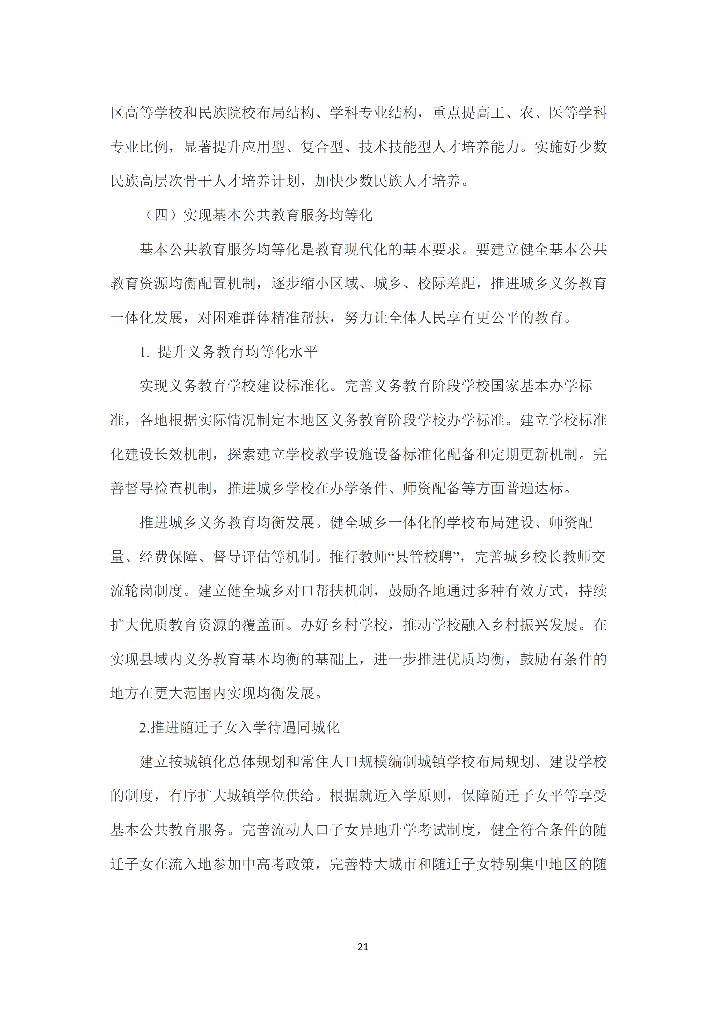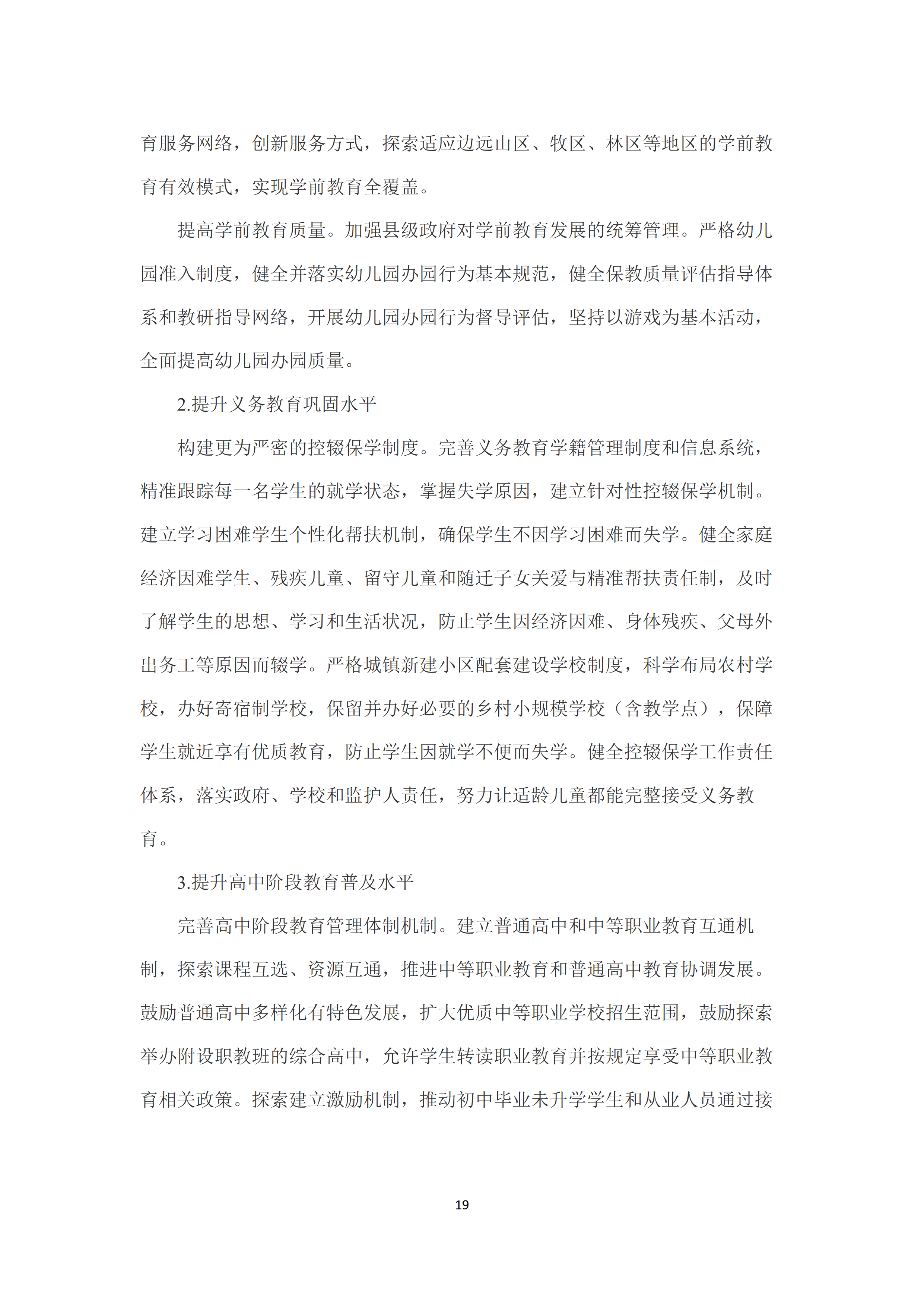 三是推动各级教育高水平高质量普及。以农村为重点提升学前教育普及水平,建立更为完善的学前教育管理体制、办园体制和投入体制,大力发展公办园,加快发展普惠性民办幼儿园。提升义务教育巩固水平,健全控辍保学工作责任体系。提升高中阶段教育普及水平,推进中等职业教育和普通高中教育协调发展,鼓励普通高中多样化有特色发展。振兴中西部地区高等教育。提升民族教育发展水平。