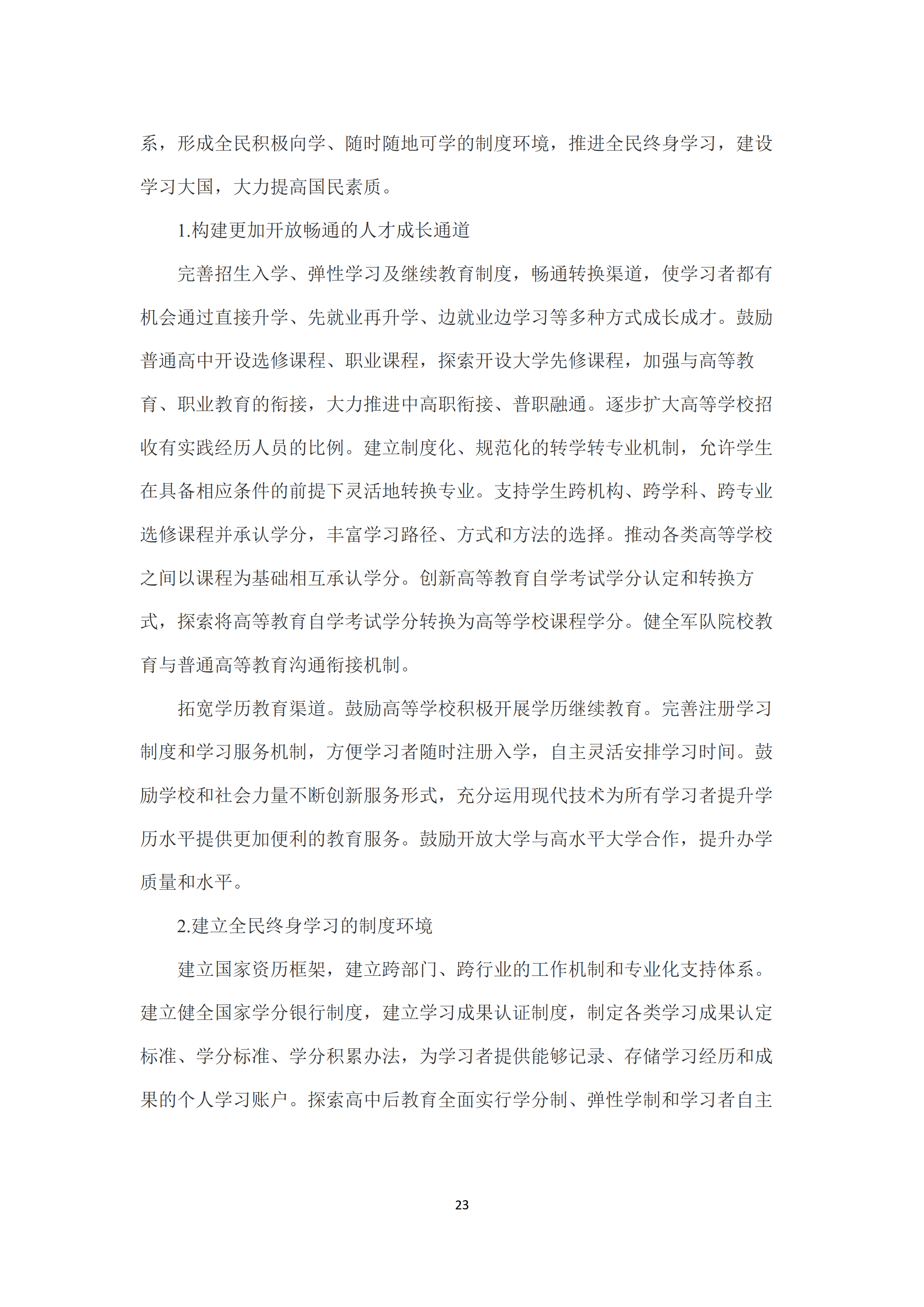 五是构建服务全民的终身学习体系。构建更加开放畅通的人才成长通道,完善招生入学、弹性学习及继续教育制度,畅通转换渠道。建立全民终身学习的制度环境,建立国家资历框架,建立跨部门跨行业的工作机制和专业化支持体系。建立健全国家学分银行制度和学习成果认证制度。强化职业学校和高等学校的继续教育与社会培训服务功能,开展多类型多形式的职工继续教育。扩大社区教育资源供给,加快发展城乡社区老年教育,推动各类学习型组织建设。