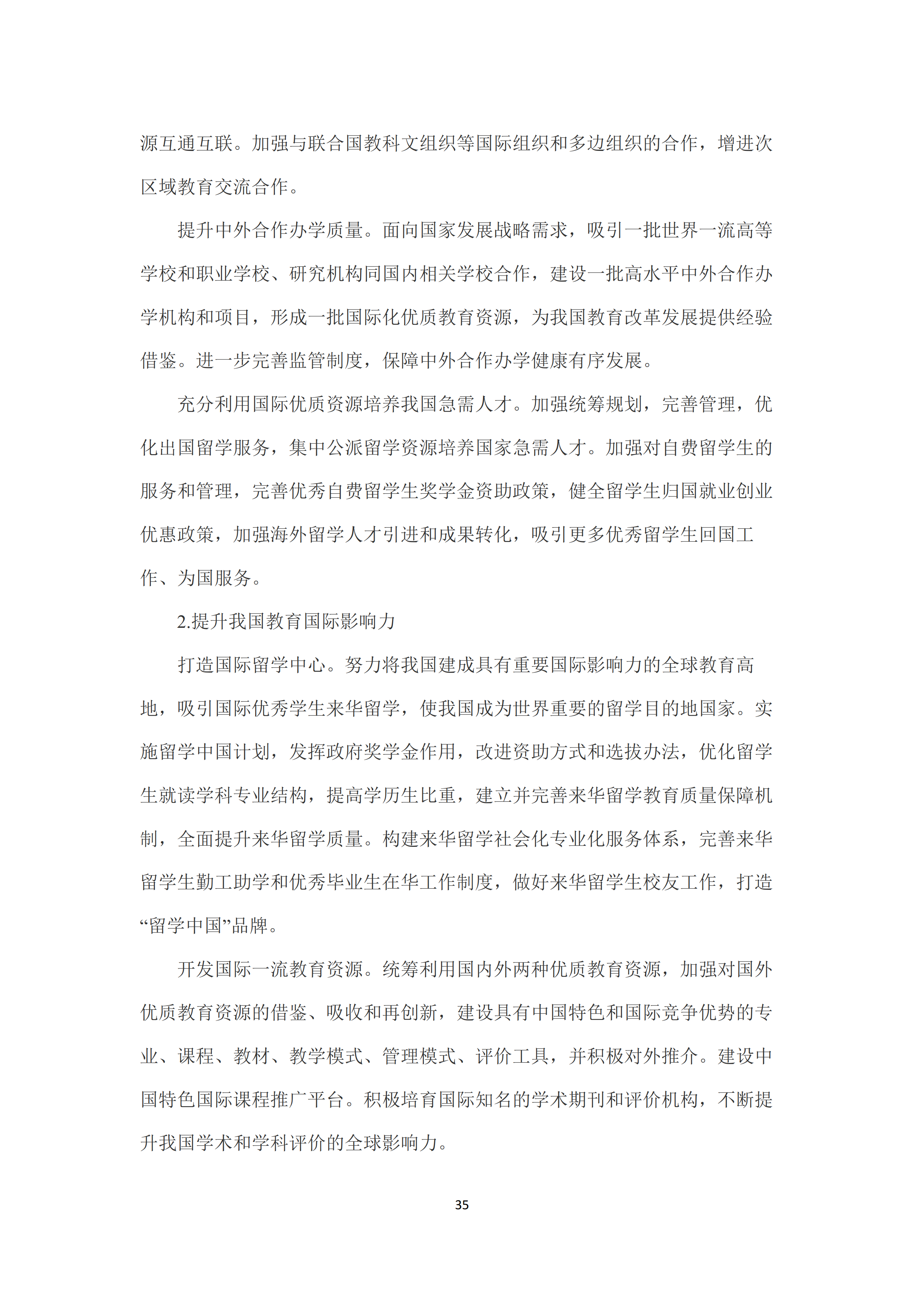 九是开创教育对外开放新格局。全面提升国际交流合作水平,推动我国同其他国家学历学位互认、标准互通、经验互鉴。扎实推进“一带一路”教育行动。加强与联合国教科文组织等国际组织和多边组织的合作。提升中外合作办学质量。优化出国留学服务。实施留学中国计划,建立并完善来华留学教育质量保障机制,全面提升来华留学质量。推进中外高级别人文交流机制建设,拓展人文交流领域,促进中外民心相通和文明交流互鉴。促进孔子学院和孔子课堂特色发展。加快建设中国特色海外国际学校。鼓励有条件的职业院校在海外建设“鲁班工坊”。积极参与全球教育治理,深度参与国际教育规则、标准、评价体系的研究制定。推进与国际组织及专业机构的教育交流合作。健全对外教育援助机制。